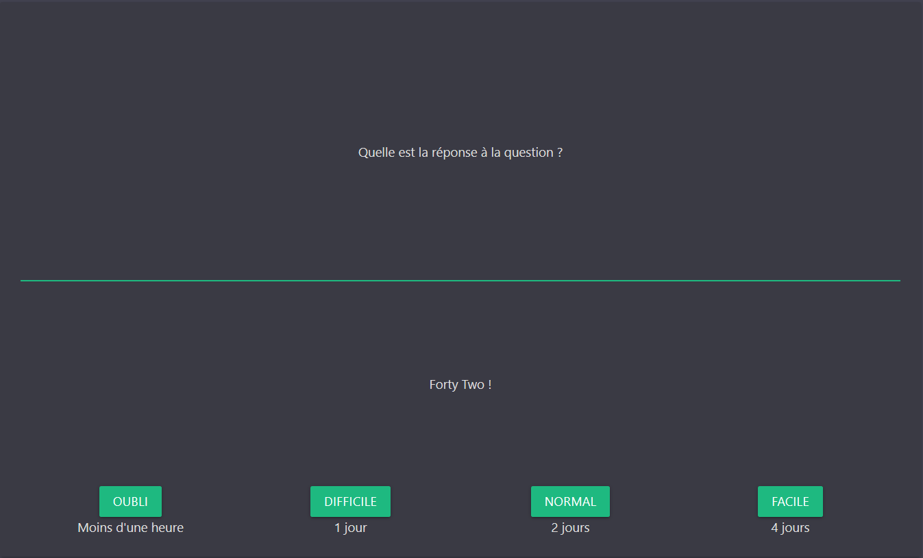 Si vous vous souvenez de la réponse l'application vous fera réviser deux jours plus tard. Si à al seconde révision vous vous souvenez toujours de la réponse, l'application vous fera réviser quatre jours plus tard et ainsi de suite!